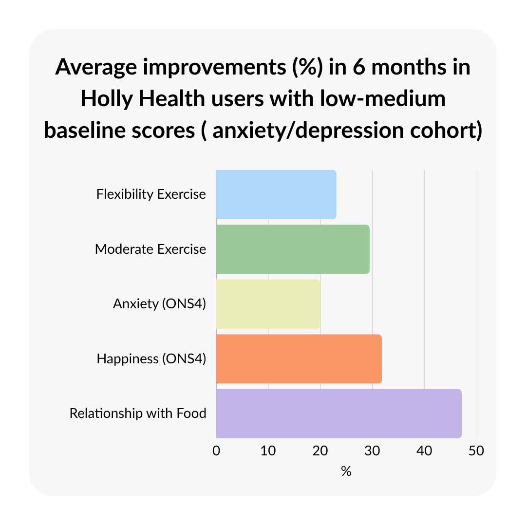 This analysis of 11,632 Holly Health users with depression and/or anxiety provides insight into how small behaviour changes are associated with physical and mental changes over time.